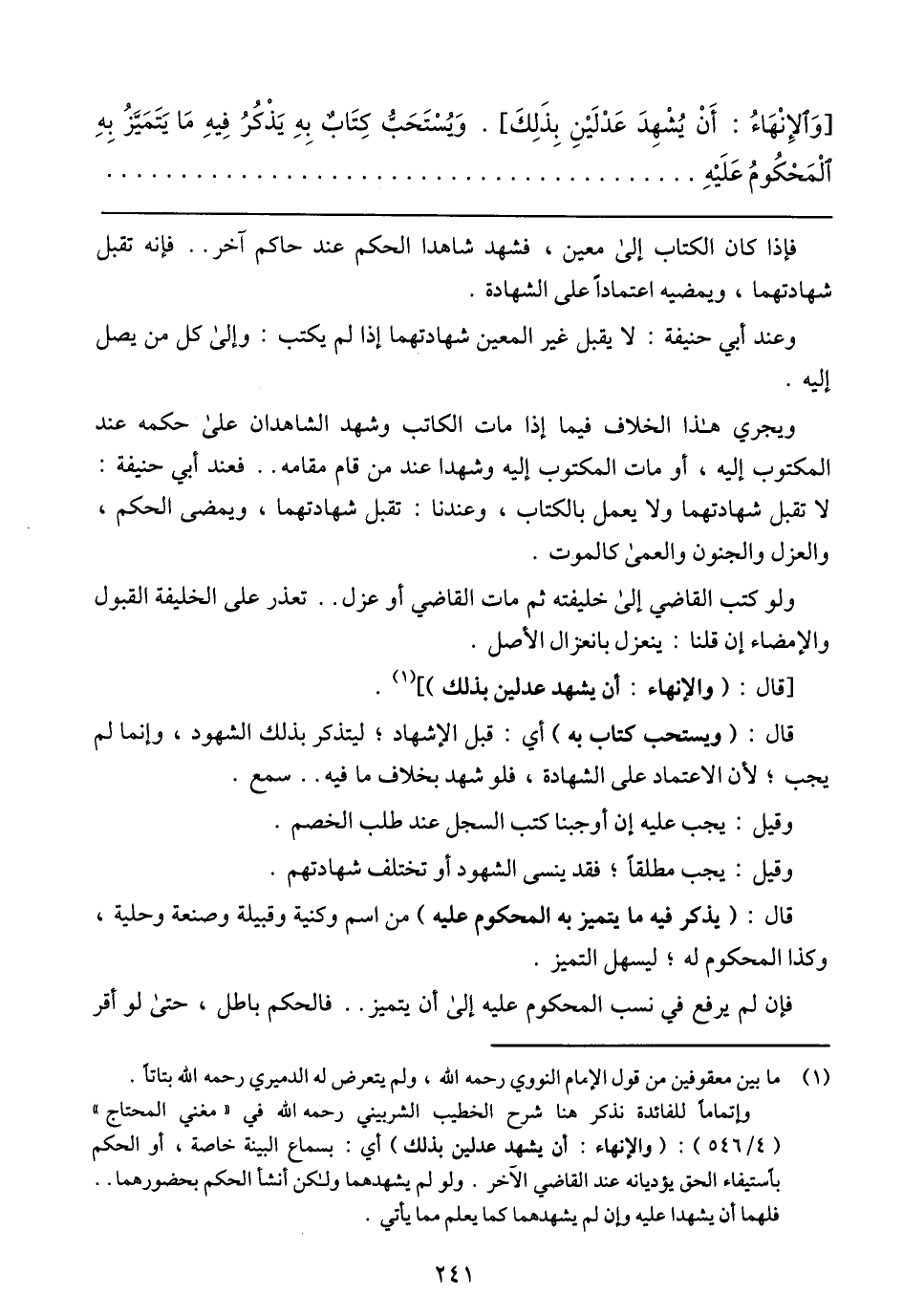 [وَالإِنْهَاءُ: أَنْ يُشْهِدَ عَدْلَيْنِ بِذَلِكَ]. وَيُسْتَحَبُّ كِتَابٌ بِهِ يَذْكُرُ فِيهِ مَا يَتَمَيَزُ بِهِ الْمَحْكُومُ عَلَيْهِ