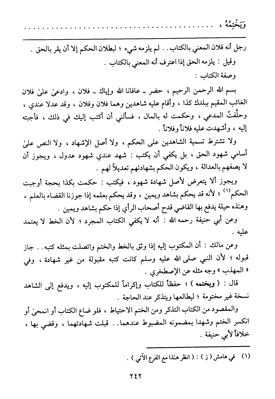 قال: (ويختمه)؛ حفظًا للكتاب وإكرامًا للمكتوب إليه, ويدفع إلي الشاهد نسخة غير مختومة؛ ليطالعها ويتذكر عند الحاجة.