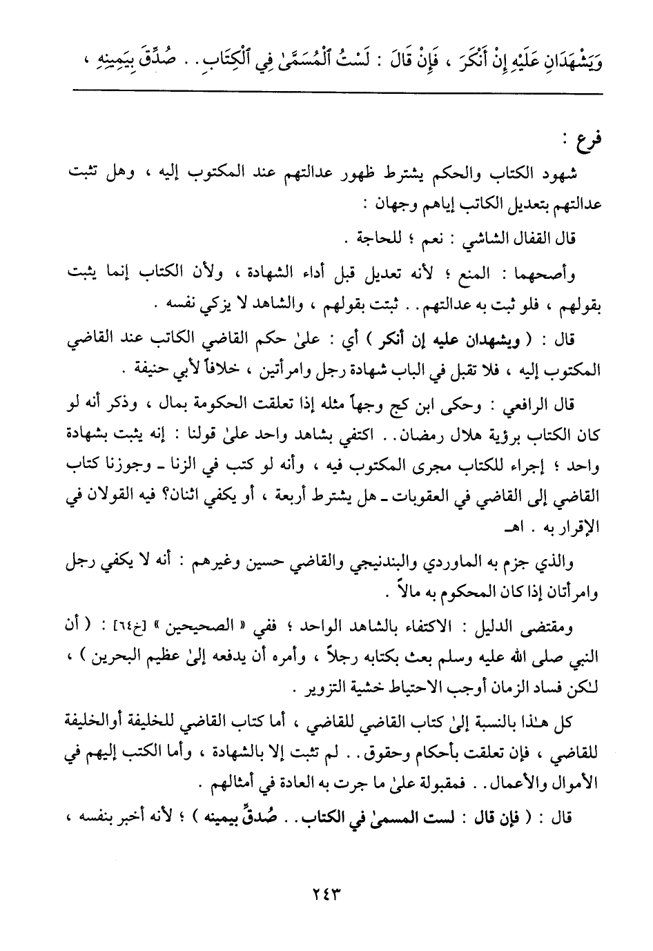 قال الرافعي: وحكي ابن كج وجهًا مثله إذا تعلقت الحكومه بمال, وذكر أنه لو كان الكتاب برؤية هلال رمضان ... اكتفي بشاهد واحد علي قولنا: إنه يثبت بشهادة واحد, إجراء للكتاب مجرى المكتوب فيه, وأنه لو كتب في الزنا– وجوزنًا كتاب القاضي إلي القاضي في العقوبات– هل يشترط أربعة, أو يكفي اثنان؟ فيه القولان في الإقرار به. اھ