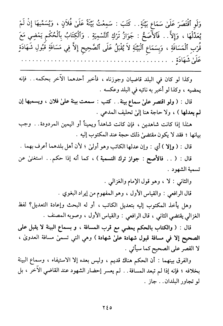 قال: (والكتاب بالحكم يمضي مع قرب المسافة, وبسماع البينة لا يقبل على الصحيح إلا في مسافة قبول شهادة على شهادة) وهي التي تسمى العدوى, لا القصر علي الصحيح كما سيأتي.
