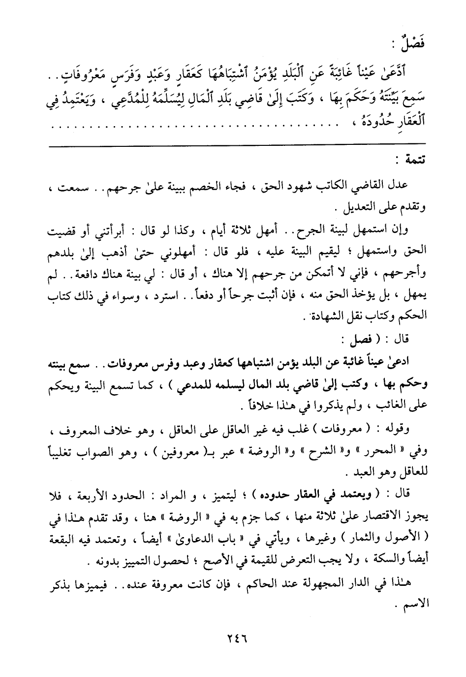 ادَّعَي عَيْنًا غَاِئَبَه عَنِ اَلْبَلَدِ يُؤْمَنُ اشْتِبَاهُهَا كَعَقَارٍ وَعَبَدٍ وَفَرَسٍ مَعرُوفَاتٍ ... سَمِعَ بَيَّنَهُ وَحَكَمَ بِهَا, وَكَتَبَ إِلَي قَاضِي بَلدِ المَالِ لِيُسَلِّمَهُ لِلمُدَّعِي, وَيَعَتَمِدُ فِي اَلَعقَارِ حُدُودَهُ,