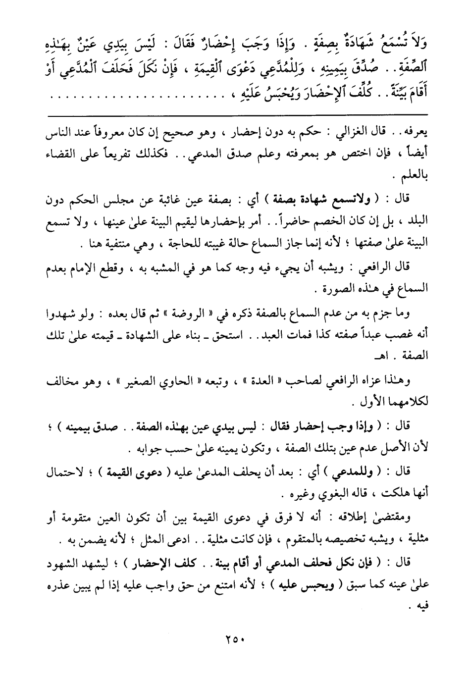 وَلاَ تُسمَعُ شَهَادَةُ بِصِفَةٍ. وَإِذَا وَجَبَ إِحْضَارٌ فَقَالَ: لَيْسَ بِيَدِي عَيَنٌ بِهَذِهِ الصِّفَةِ .. صُدِّقَ بِيَمينِهِ, وَلِلمُدَّعِي دَعوَى القيِمَةِ , فَإِنْ نَكَلَ فَحَلفَ اَلمُدَّعِى أَوْ أَقَامَ بَيِّنةَ ... كُلَّفَ الإِحْضَارَ وَيُحْبَسُ عَلَيِه,