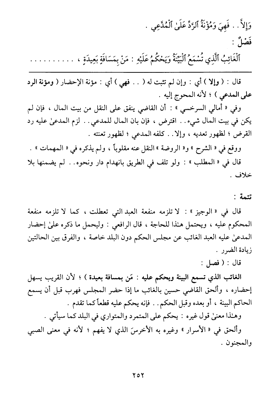 الغائب الذي تسمع البينة ويحكم عليه: مَن بمسافة بعيدة) , لأن القريب يسهل إحضاره, وألحق القاضي حسين بالغائب ما إذا حضر المجلس فهرب قبل أن يسمع الحاكم البينة, أو بعده وقبل الحكم ... فإنه يحكم عليه قطعًا كما تقدم.