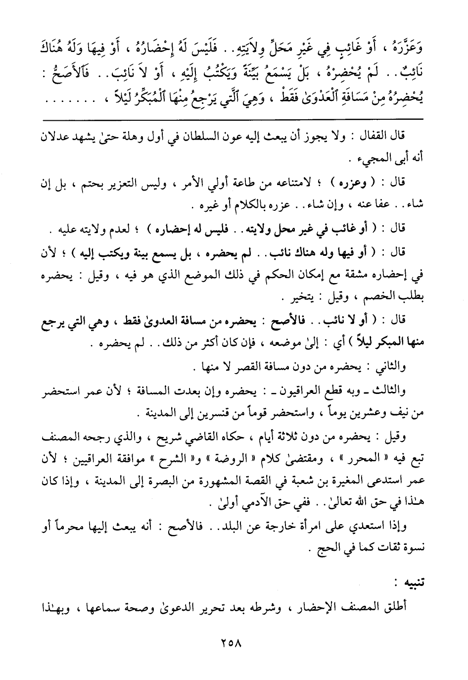 وَعَزَّرَهُ, أَوْ غَائِبٍ فِي غَيِر مَحَلِّ وَلاَيَتِهِ .. فَلَيسَ لَهُ إِحْضَارُهُ, أَو فِيهَا وَلَهُ هُنَاَك نَائِبُ .. لَم يُحضِرهُ, بَلْ يَسْمَعُ بَيّنةً وَيَكْتُب إِلَيِه, أَوْ لَا نَائِبَ .. فَالأَصَحُّ: ُيحضرهُ مِنْ مَسَافةِ العَدوَى فقَط, وَهِيَ الَّتي يَرْجِعً مِنْهَا المُبَكِّرُ لَيلًا,