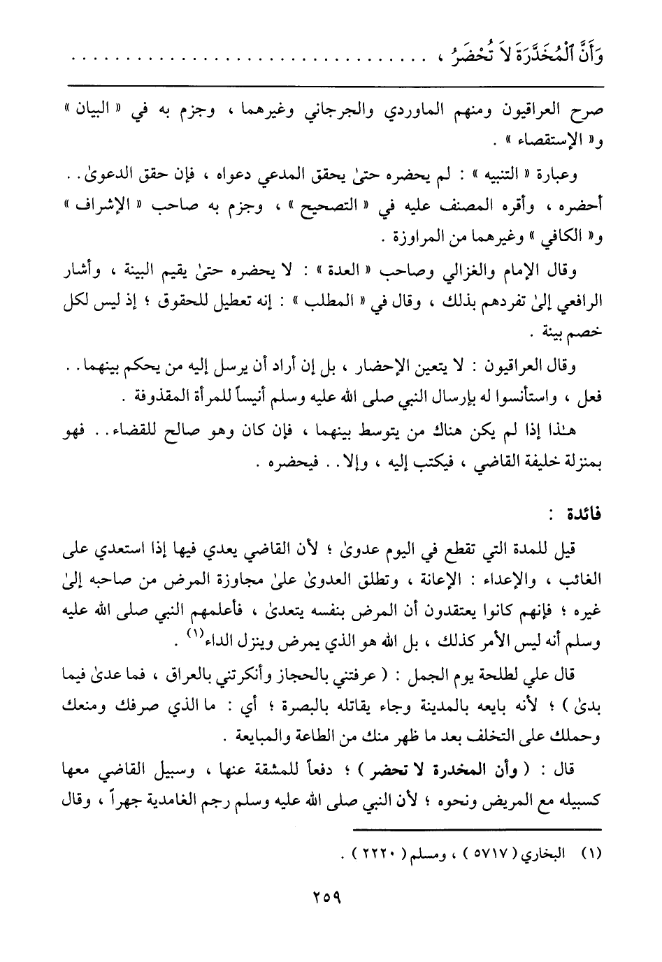 قال: (وأن المخدرة لا تحضر)؛ دفعًا للمشقة عنها, وسبيل القاضي معها كسبيله مع المريض ونحوه, لأن النبي صلى الله عليه وسلم رجم الغامدية جهرًا, وقال