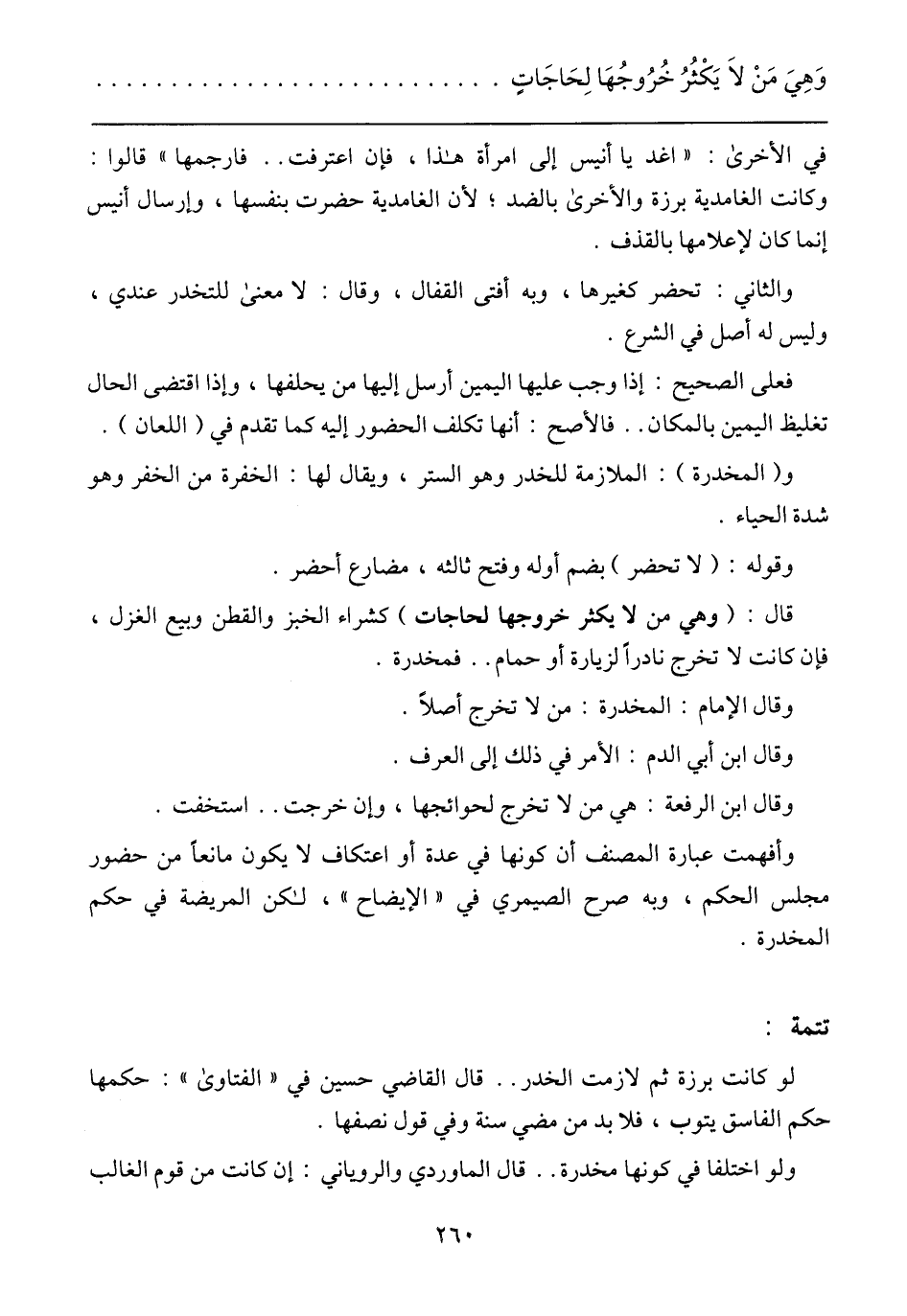 وَهِيَ مَنْ لَا يَكْثُرُ خُرُوجُهَا لِحَاجَاتٍ