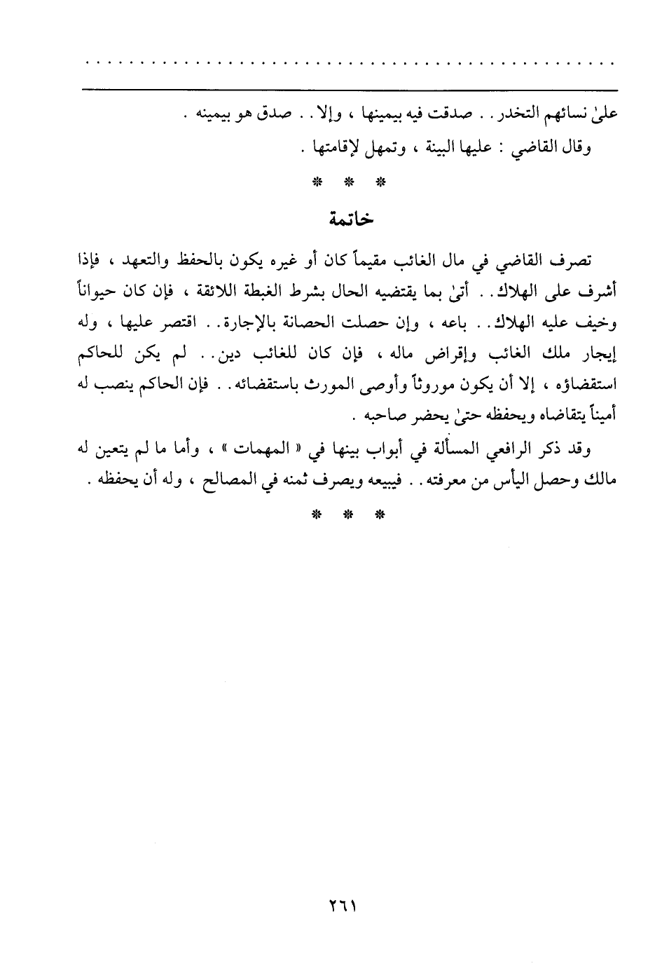 تصرف القاضي في مال الغائب مقيمًا كان أو غيره يكون بالحفظ والتعهد, فإذا أشرف على الهلاك .. أتى بما يقتضيه الحال بشرط الغبطة الائقة, فإن كان حيوانًا وخيف علي الهلاك ..