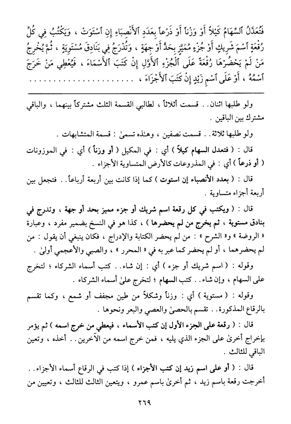 قال: (ويكتب في كل رقعة اسم شريك أو جزء مميز بحد أو جهة, وتدرج في بنادق مستوية, ثم يخرج من لم يحضرها) , كذا هو في النسخ بضمير مفرد, وعبارة (الروضة) و (الشرح): من لم يحضر الكتابة والإدراج, فكان ينبغي أن يقول: من لم يحضرهما, أو لم يحضر كما عبر به في (المحرر) , والصبي والأعجمي أولى.