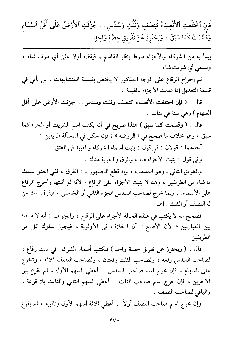 قال: (ويحترز عن تفريق حصة واحد) فيكتب أسماء الشركاء في ست رقاع, لصاحب السدس رقعة, ولصاحب الثلث رقعتان, ولصاحب النصف ثلاثة, وتخرج على السهام, فإن خرج اسم صاحب السدس .. أعطي السهم الأول, ثم يقرع بين الآخرين, فإن خرج اسم صاحب الثلث .. أعطي السهم الثاني والثالث بلا قرعة, والباقي لصاحب النصف.