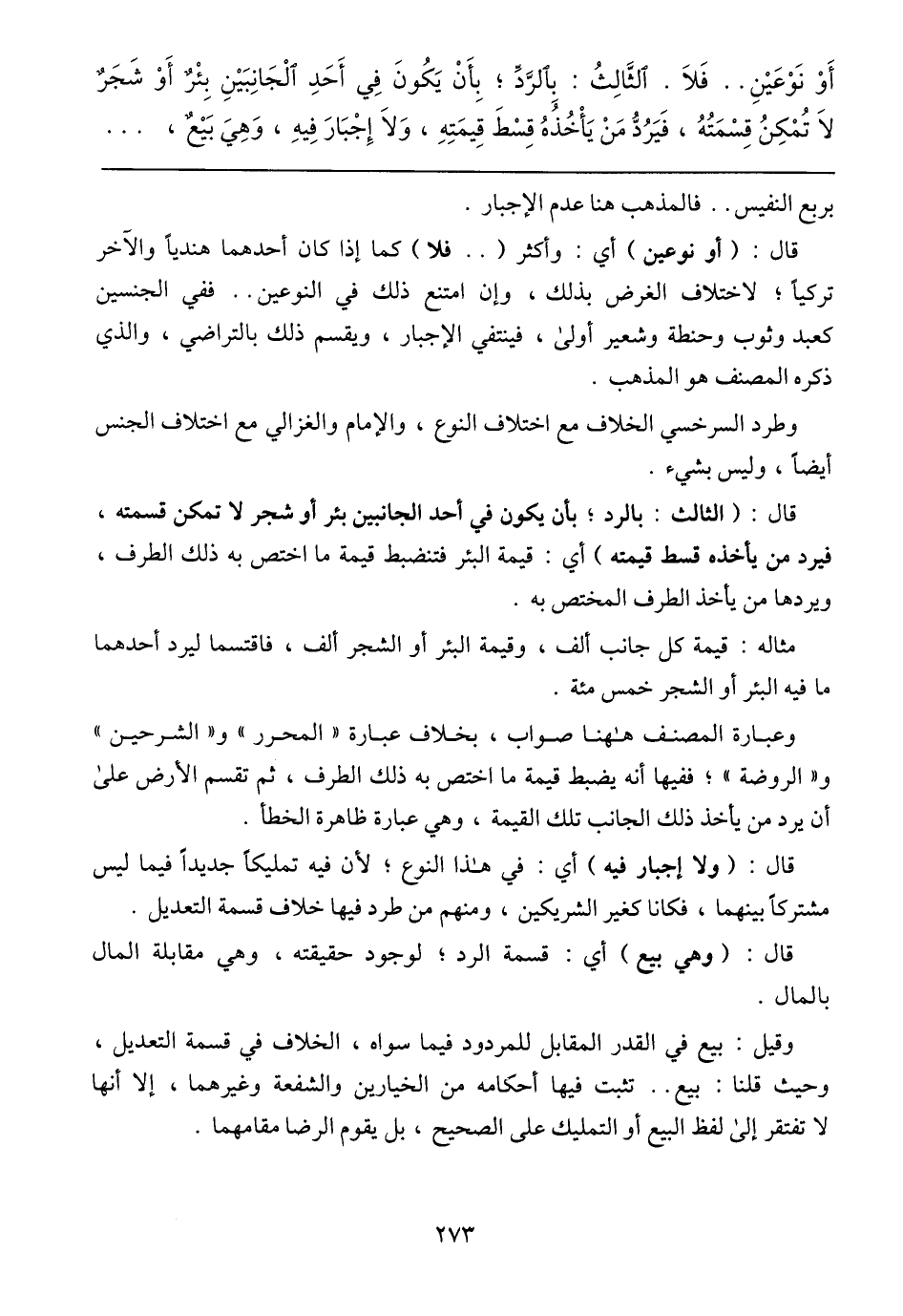 اَوْ نَوْعَيْنِ .. فَلاَ. الثَّالِثُ: بِالرَّدِّ؛ بِأَنْ يَكُونَ فِي أَحَدِ الْجَانِبَيْنِ بِئْرٌ أَوْ شَجَرٌ لاَ تُمْكِنُ قِسْمَتُهُ، فَيَرُدُّ مَنْ يَاخُذُهُ قِسْطَ قِيمَتِهِ، وَلاَ إِجْبَارَ فِيهِ، وَهِيَ بَيْعٌ،