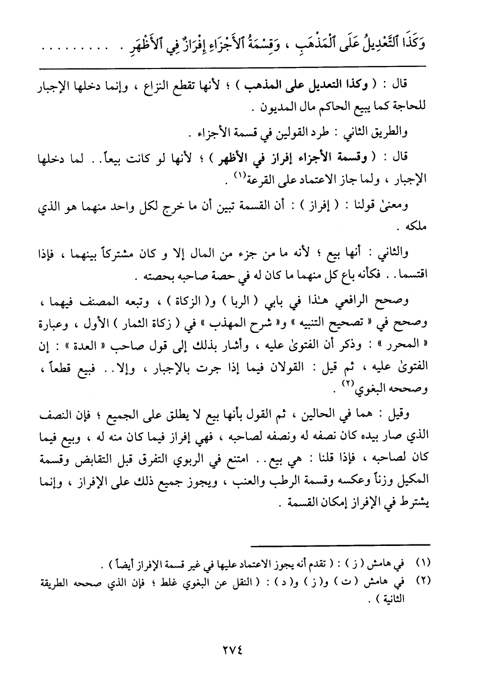 وقيل: هما في الحالتين، ثم القول بأنها بيع لا يطلق على الجميع؛ فإن النصف الذي صار بيده كان نصفه له ونصفه لصاحبه، فهي إفراز فيما كان منه له، وبيع فيما كان لصاحبه، فإذا قلنا: هي بيع .. امتنع في الربوي التفرق قبل التقابض وقسمة المكيل وزنًا وعكسه وقسمة الرطب والعنب، ويجوز جميع ذلك على الإفراز، وإنما يشترط في الإفراز إمكان القسمة.