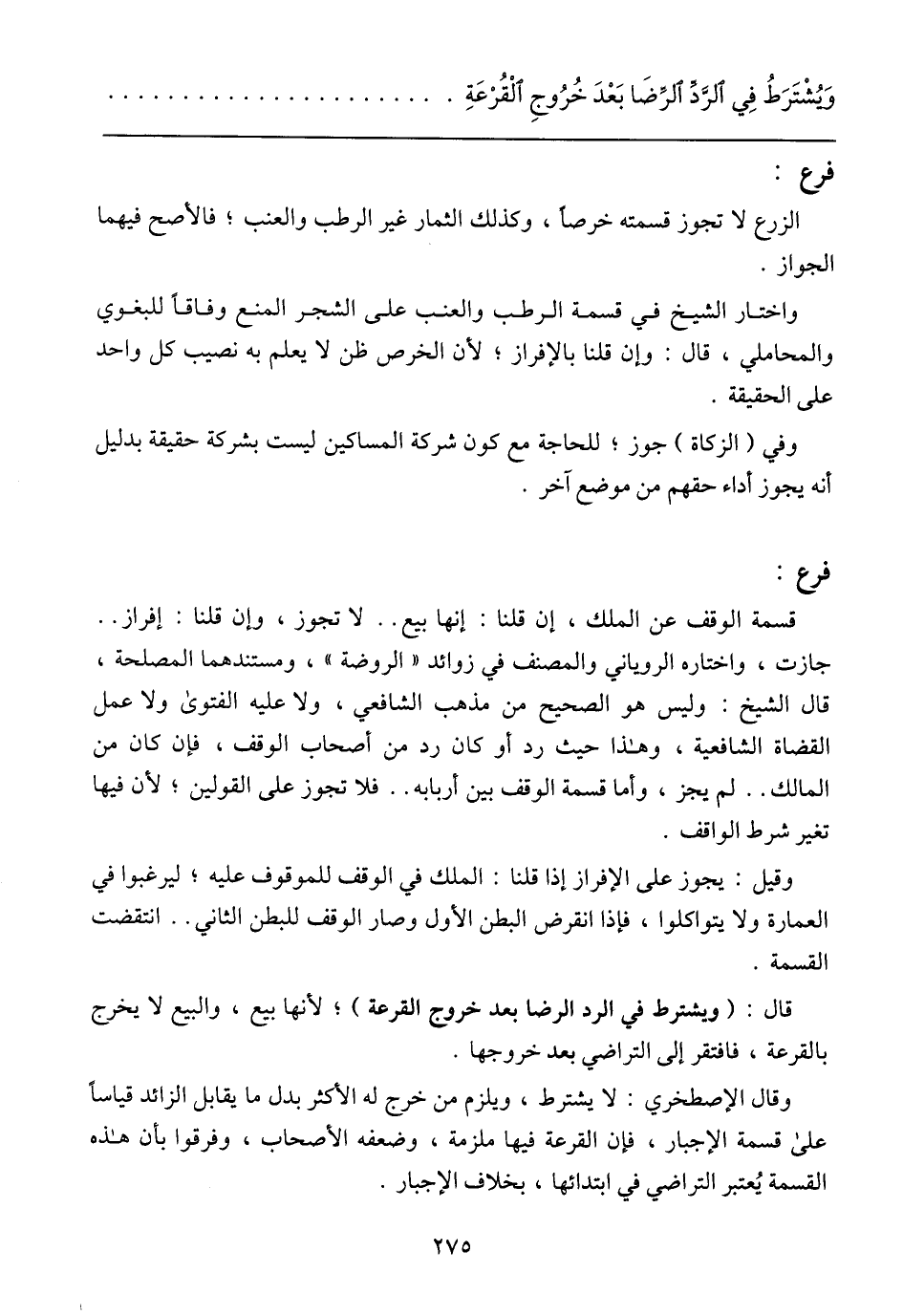 وقال الإصطخري: لا يشترط، ويلزم من خرج له الأكثر بدل ما يقابل الزائد قياسًا على قسمة الإجبار، فإن القرعة فيها ملزمة، وضعفه الأصحاب، وفرقوا بأن هذه القسمة يُعتبر التراضي في ابتدائها، بخلاف الإجبار.