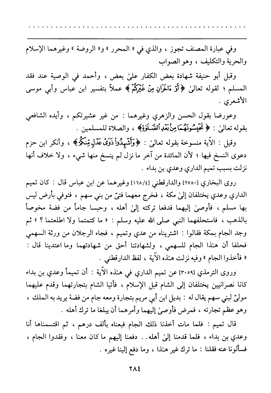 وقيل: الآية منسوخة بقوله تعالى: {وَأَشْهِدُوا ذَوَى عَدْلٍ مِّنكُمْ}، وأنكر ابن حزم دعوى النسخ فيها؛ لأن المائدة من آخر ما نزل لم ينسخ منها شيء، ولا خلاف أنها نزلت بسبب تميم الداري وعدي بن بداء.