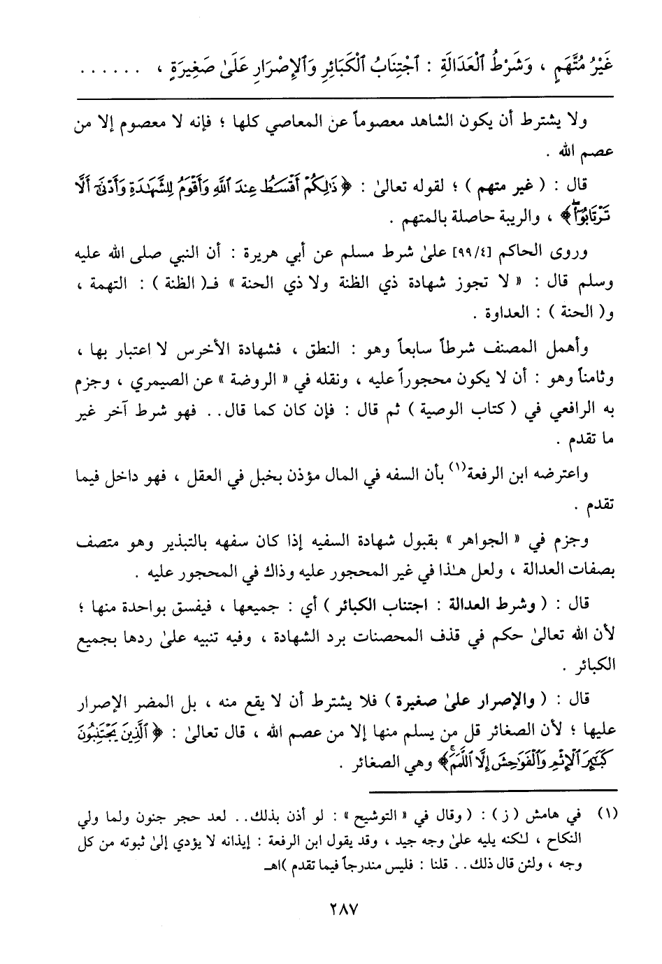 قال: (والإصرار على صغيرة) فلا يشترط أن لا يقع منه، بل المضر الإصرار عليها؛ لأن الصغائر قل من يسلم منها إلا من عصم الله، قال تعالى: {الَّذِينَ يَجْتَنِبُونَ كَبَائِرَ الإِثْمِ وَالْفَوَاحِشَ إِلاَّ اللَّمَمَ} وهي الصغائر.