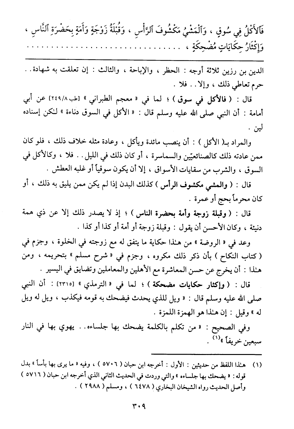 قال: (وإكثار حكايات مضحكة)؛ لما في (الترمذي) (2315): أن النبي صلى الله عليه وسلم قال: (ويل للذي يحدث فيضحك به قومه فيكذب، ويل له ويل له) وقيل: إن هذا هو الهمزة اللمزة.