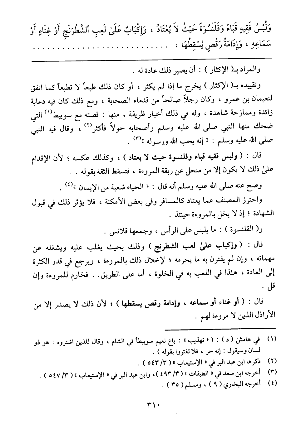 قال: ولبس فقيه وقلنسوة حيث لا يعتاد)، وكذلك عكسه؛ لأن الإقدام علي ذلك لا يكون إلا من منحل عن ربقة المروءة، فتسقط الثقة بقوله.