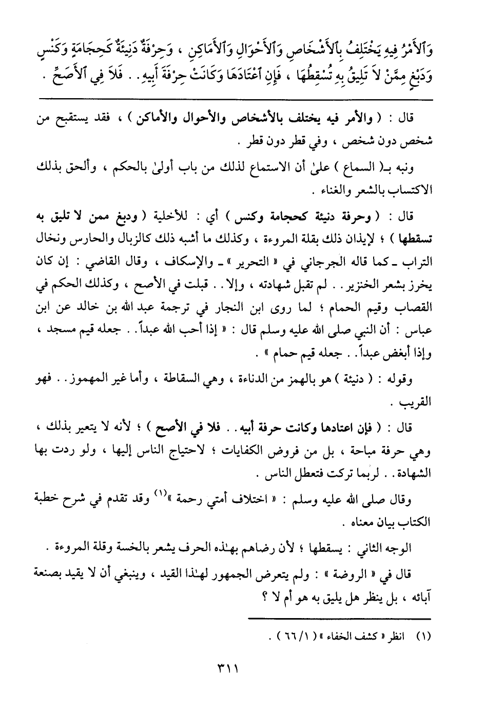 قال: (والأمر فيه يختلف بالأشخاص والأحوال والأماكن) ر فقد يستقيح من شخص دون شخص، وفي قطر دون قطر.