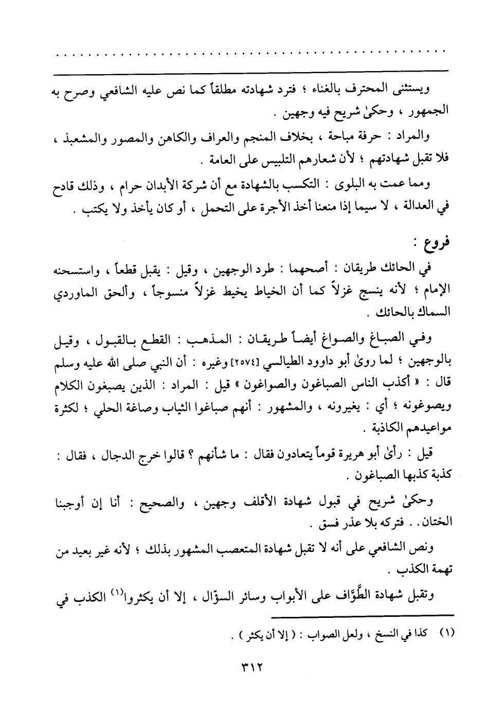 وفي الصباغ والصواغ أيضًا طريقان: المذهب: القطع بالقبول، وقيل بالوجهين؛ لما روي أبو داوود الطيالسي (2574) وغيره: أن النبي صلي الله عليه سلم قال: (أكذب الناس الصباغون والصواغون) قيل: المراد: الذين يصبغون الكلام ويصوغونه؛ أي يغيرونه، والمشهور: أنهم صباغوا الثياب وصاغة الحلي؛ لكثرة مواعيدهم الكاذبة.