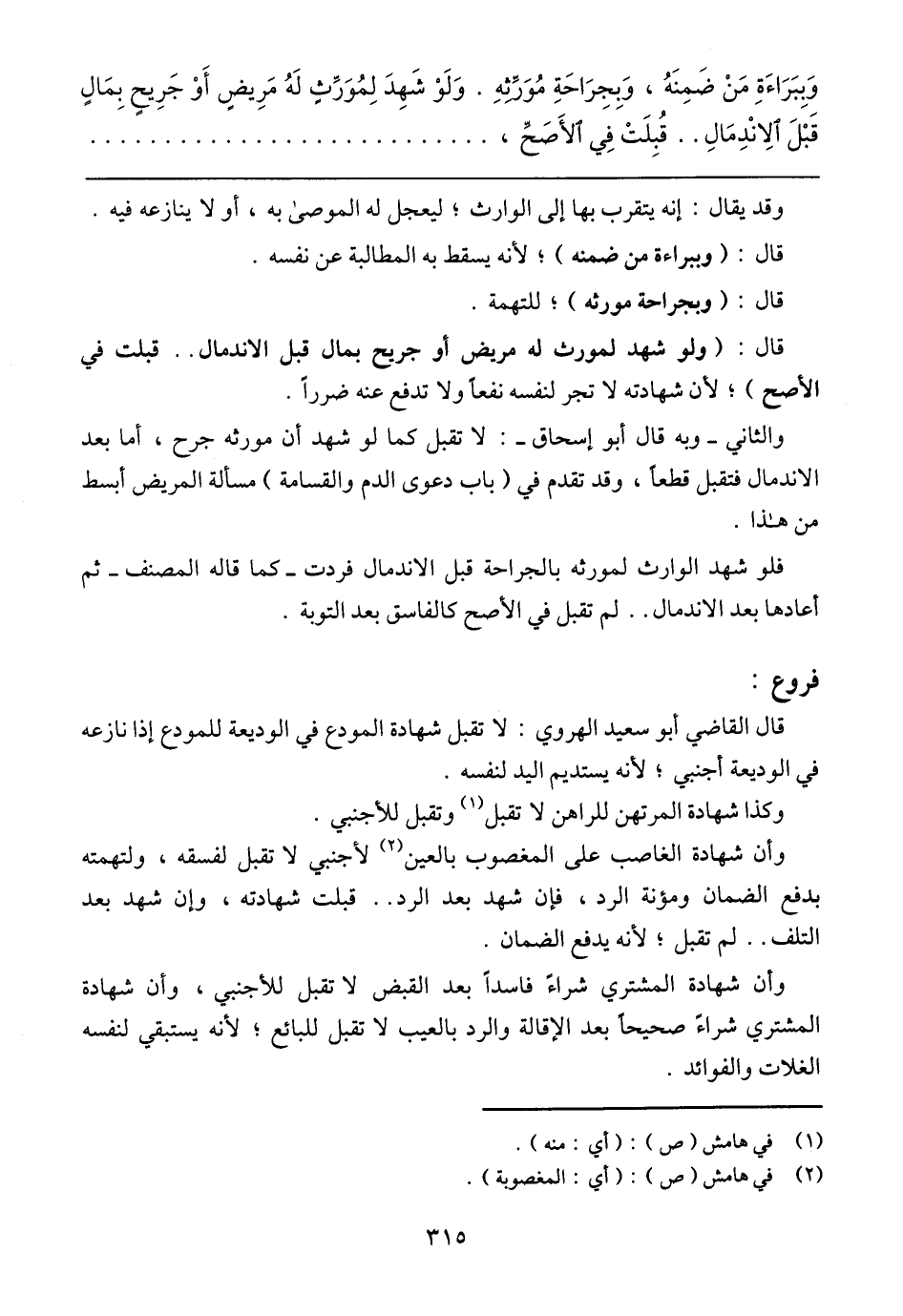 وأن شهادة المشتري شراء فاسدًا بعد القبض لا تقبل للأجنبي، وأن شهادة المشتري شراء صحيحًا بعد الإقالة والرد بالعيب لا تقبل للبائع؛ لأنه يستبقي لنفسه الغلات والفوائد.