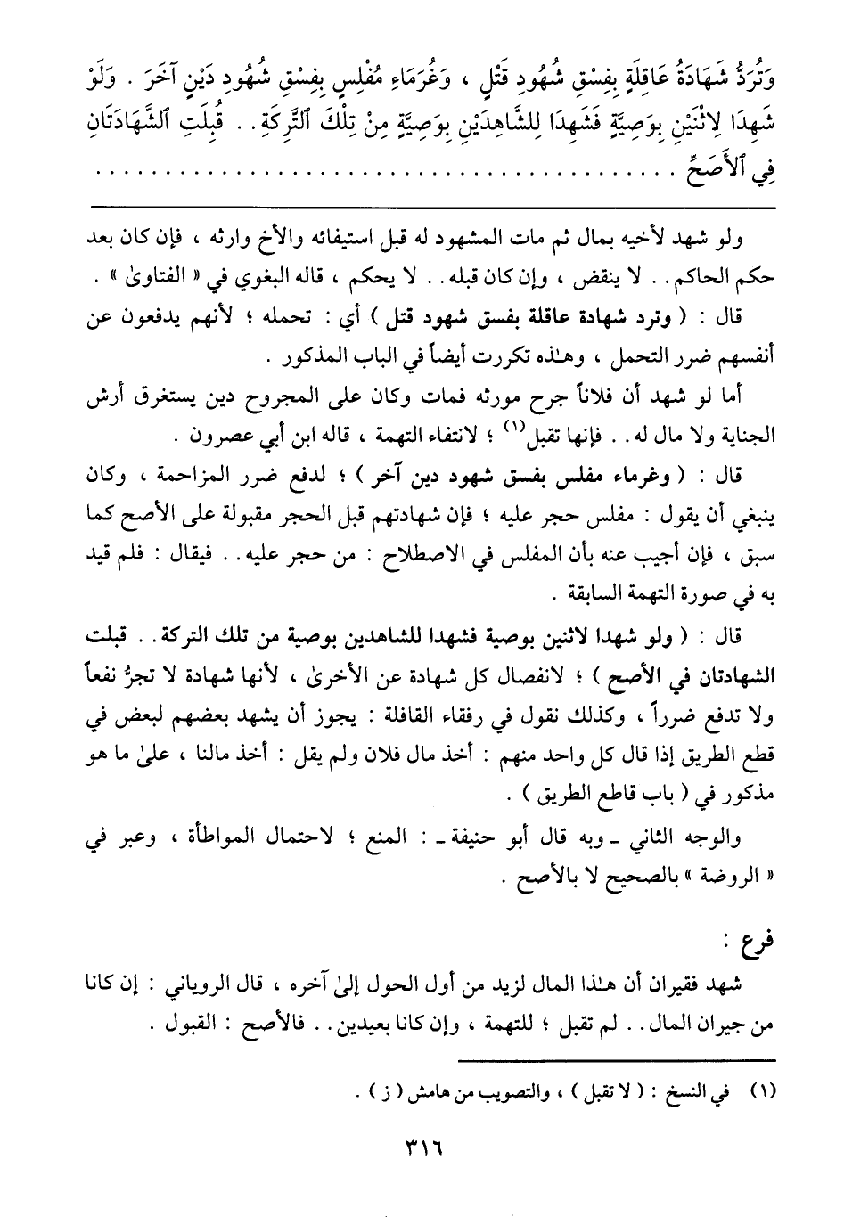 وَتُرَدُّ شَهَادَةُ عَاقِلَةٍ بِفِسْقِ شُهُودِ قَتْلٍ، وَغُرَمَاءِ مُفْلِسٍ بِفِسْق شُهُودِ دَيْنٍ آخَرَ. وَلَوْ شَهِدَا لِاثَنْيِن بِوَصِيَّةٍ فَشَهِدَا لِلشَّاهِدَيْنِ بِوَصِيَّةٍ مِنْ تِلْكَ التَّرِكَةِ .. قُبِلَتِ الشَّهَادَتَانِ فِي الأَصَحِّ