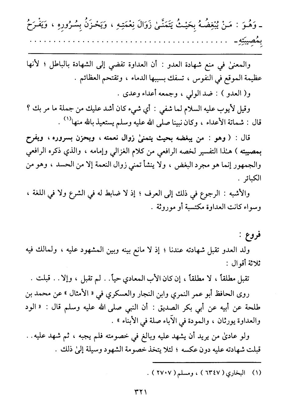 قال: (وهو: من يبغضه بحيث يتمني زوال نعمته، ويحزن بسروره، ويفرح بمصيبته) هذا التفسير لخصه الرافعي من كلام الغزالي وإمامه، والذي ذكره الرافعي والجمهور إنما هو مجرد البغض، ولا ينشأ تمني زوال النعمة إلا من الحسد، وهو من الكبائر.