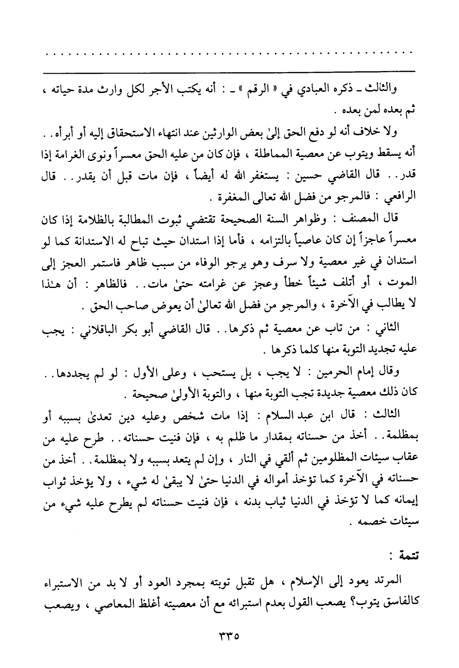 الثالث: قال ابن عبد السلام: إذا مات شخص وعليه دين تعدى بسببه أو بمظلمة .. أخذ من حسناته بمقدار ما ظلم به, فإن فنيت حسناته .. طرح عليه من عقاب سيئات المظلومين ثم ألقي في النار, وإن لم يتعد بسببه ولا بمظلمة .. أخذ من حسناته في الآخرة كما تؤخذ في الدنيا حتى لا يبقى له شيء, ولا يؤخذ ثواب إيمانه كما لا تؤخض في الدنيا ثياب بدنه, فإن فنيت حسناته لم يطرح عليه شيء من سيئات خصمه.
