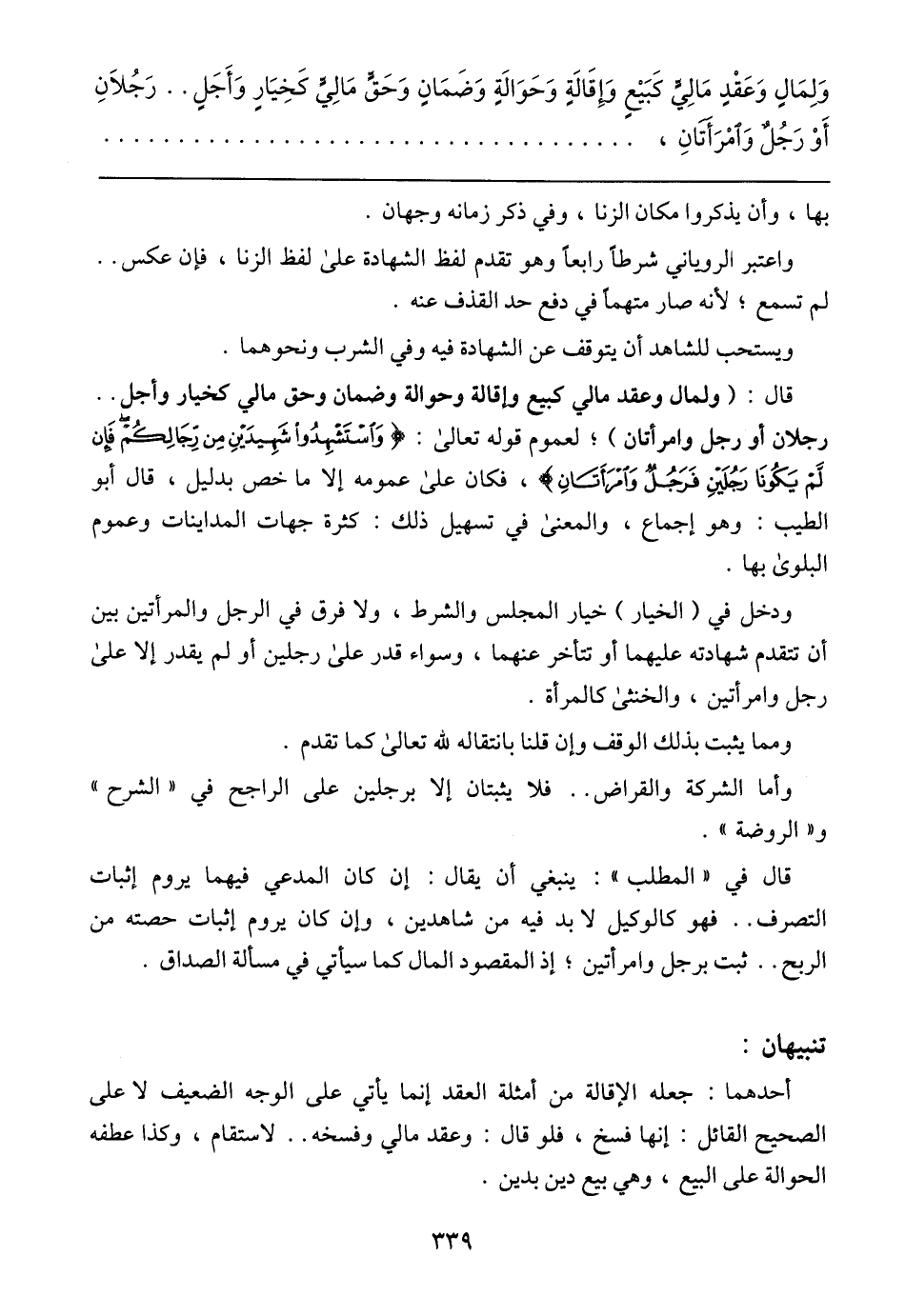 وَلِمَالٍ وَعقدٍ مَالِيٍّ كَبَيعٍ وَإقَالَةٍ وَحَوَالَةٍ وَضَمَانٍ وَحَقِّ مَالِيِّ كَخِيَارٍ وَأجَلٍ .. رَجُلانِ أَو رَجُلٌ وَامرَأَتَانِ,