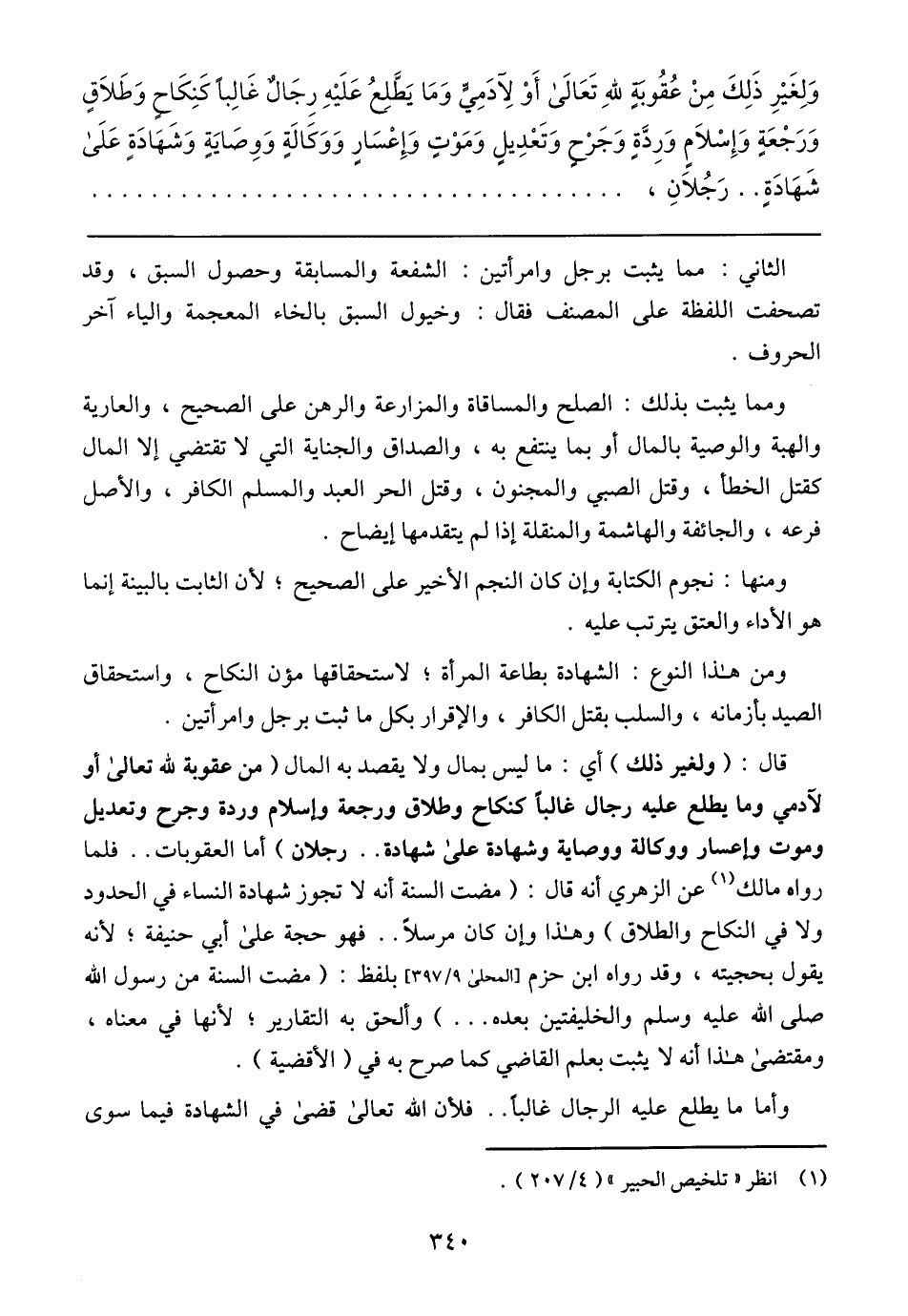 وَلِغَيرِ ذَلِكَ مِن عُقُوَبةٍ للهِ تَعالَى أو لِآدمِيِّ وَمَا يَطَّلِعُ عَلَيهِ رِجَالٌ غَالِبًا كَنِكَاحٍ وَطَلاَقٍ وَرَجعَةٍ وَإسلاَم وَرَدَّةٍ وَجَرحٍ وَتَعدِيلٍ وَمَوتٍ وَإعسَارٍ وَوَكَالَةٍ وَوِصَايةٍ وَشَهَادَةٍ عَلَى شَهَادَةٍ .. رَجُلاَنِ,