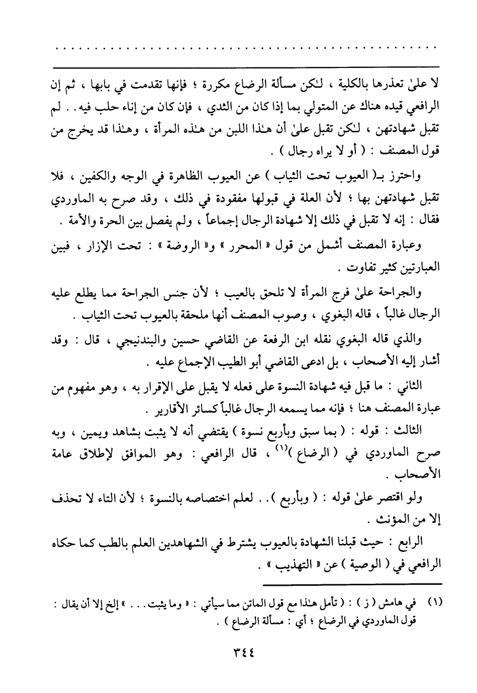 الثالث: قوله: (بما سبق وبأربع نسوة) يقتضي أنه لا يثبت بشاهد ويمين, وبه صرح الماوردي في (الرضاع) , قال الرافعي: وهو المرفق لإطلاق عامة الأصحاب.