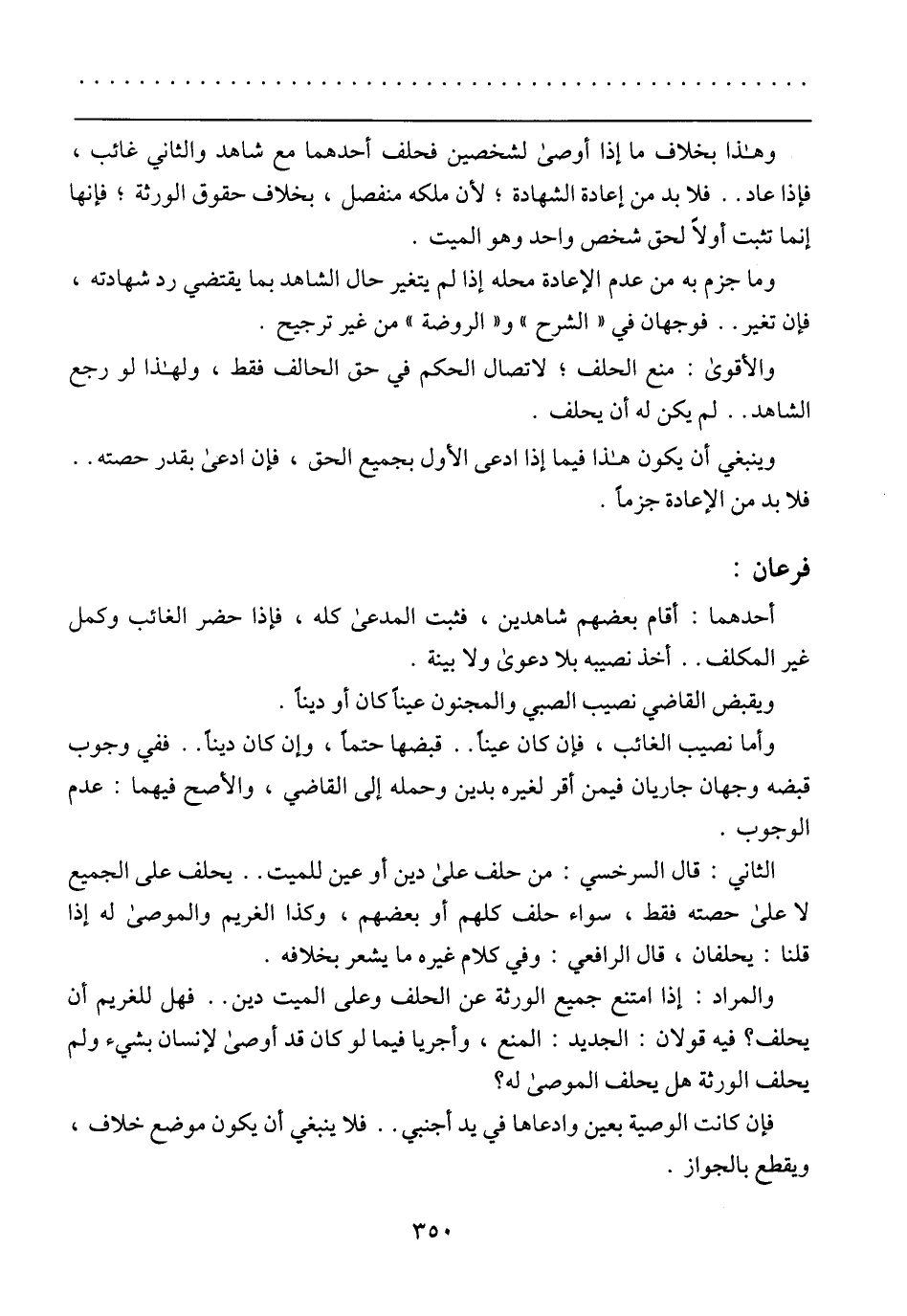 الثاني: قال السرخسي: من حلف على دين أو عين للميت .. يحلف على الجميع لا على حصته فقط, سواء حلف كلهم أو بعضهم, وكذا الغريم والموصى له إذا قلنا: يحلفان, قال الرافعي: وفي كلام غيره ما يشعر بخلافه.