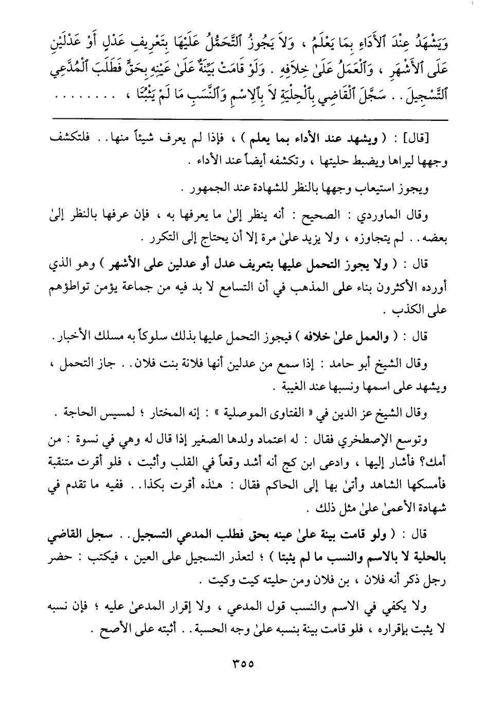 وَيَشْهَدُ عِنْدَ الأَدَاءِ بِمَا يَعْلَمُ, وَلاَ يَجُوزُ التَحَملُ عَليْهَا بِتَعْرِيفِ عَدْلٍ أَوْ عَدْلَيْنِ عَلَى الأَشْهَرِ, وَالعَمَلُ عَلَى خِلاَفِهِ. وَلَوْ قَامَتْ بَيْنَهٌ عَلَى عَيْنِهِ بِحَق فَطَلَبَ المُدعِىِ التَسْجِيل .. سَجلَ القَاضِىِ بِالحِليَة لاَ بِالإِسْمِ وَالنَسَبِ مَا لَمْ يَثْبُتَا