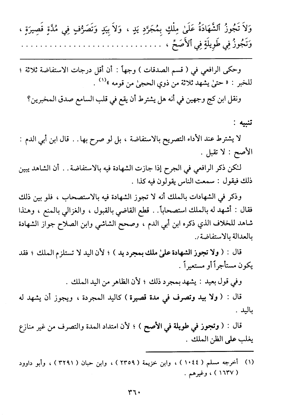 وَلاَ تَجُوزُ الشَّهّادّةُ عَلَى مِلْكٍ بِمُجَرَّدِ يَدٍ، وَلاَ بِيَدٍ وَتَصَرُّفٍ فِي مُدَّةٍ قَصِيرَةٍ، وَتَجُوزُ فِي طَوِيلَةٍ فِي الأَصَحِّ،