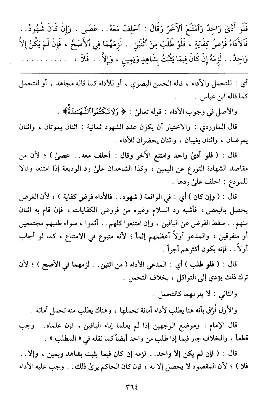 فَلَوْ أَدَّى وَاحِدٌ وَامْتَنَعَ الآخَرُ وَقَالَ: احْلِفْ مَعَهُ .. عَصَى. وَإِنْ كَانَ شُهُودٌ .. فَالأَدَاءُ فَرْضُ كِفَايَةٍ، فَلَوْ طَلَبَ مِنَ اثْنَيْنِ .. لَزِمَهُمَا فِي الأَصَحِّ، فّإِنْ لَمْ يَكُنْ إِلاَّ وَاحِدٌ .. لَزِمَهُ إِنْ كَانَ فِيمَا يثبتُ بَشَاهِدٍ وَيَمِينٍ، وَإِلاَّ .. فَلاَ،
