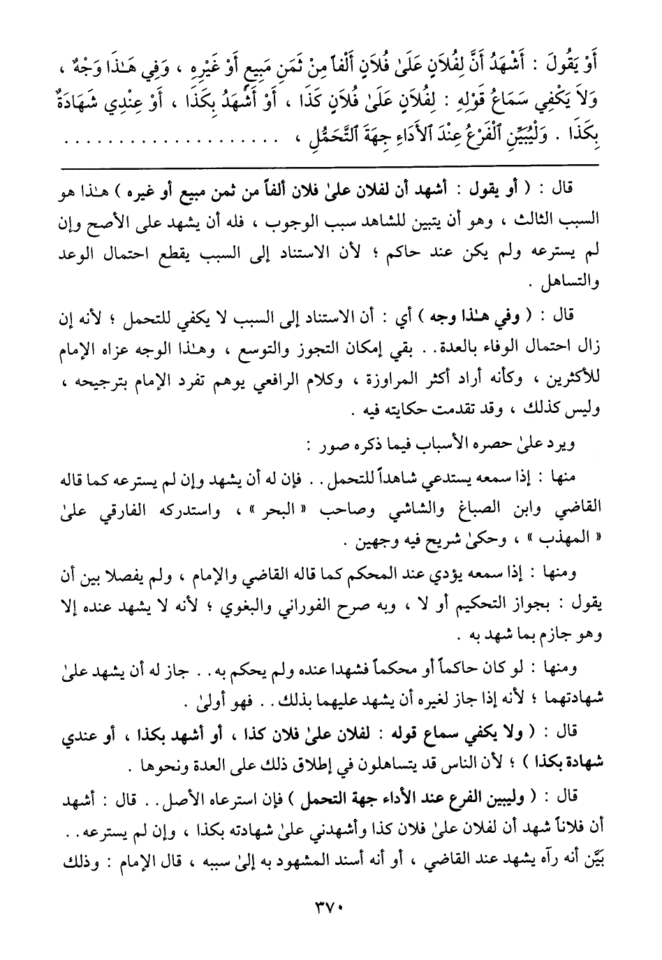 أَوْ يَقُولَ: أَشْهَدُ أَنَّ لِفُلاَنٍ عَلَى فُلاَنٍ أَلْفًا مِنْ ثَمَنِ مَبِيعٍ أَوْ غَيْرِهِ، وَفِي هَذَا وَجْهٌ، وَلاَ يَكْفِي سَمَاعُ قَوْلِهِ: لِفُلاَنٍ عَلَى فُلًانٍ كَذَا، أَوْ أَشْهَدُ بِكَذَا، أَوْ عِنْدِي شَهَادَةٌ بِكَذَا. وَلْيُبَيِّنِ الْفرْعُ عِنْدَ الأَدَاءِ جِهَةَ التَّحَمُّلِ،