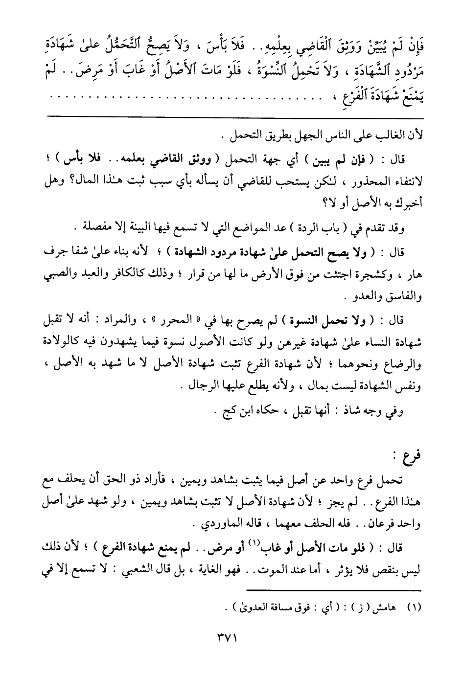 تحمل فرع واحد عن أصل فيما يثبت بشاهد ويمين، فأراد ذو الحق أن يحلف مع هذا الفرع .. لم يجز؛ لأن شهادة الأصل لا تثبت بشاهد ويمين، ولو شهد على أصل واحد فرعان .. فله الحلف معهما، قاله الماوردي.