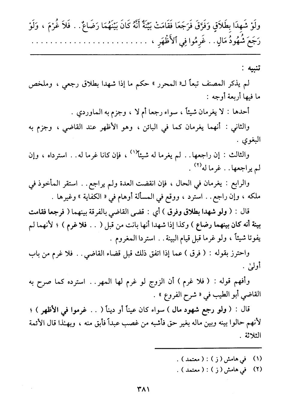 وَلَوْ شَهِدَا بِطَلاَقٍ وَفَرقَ فَرَجَعَا فَقَامَتْ بَينَةٌ أَنَهُ كَانَ بَيْنَهُمَا رَضَاعٌ .. فَلاَ غُرْمَ, وَلَوْ رَجَعَ شُهِودُ مَالٍ .. غَرِمُوا فِيِ الأَظْهَرِ,