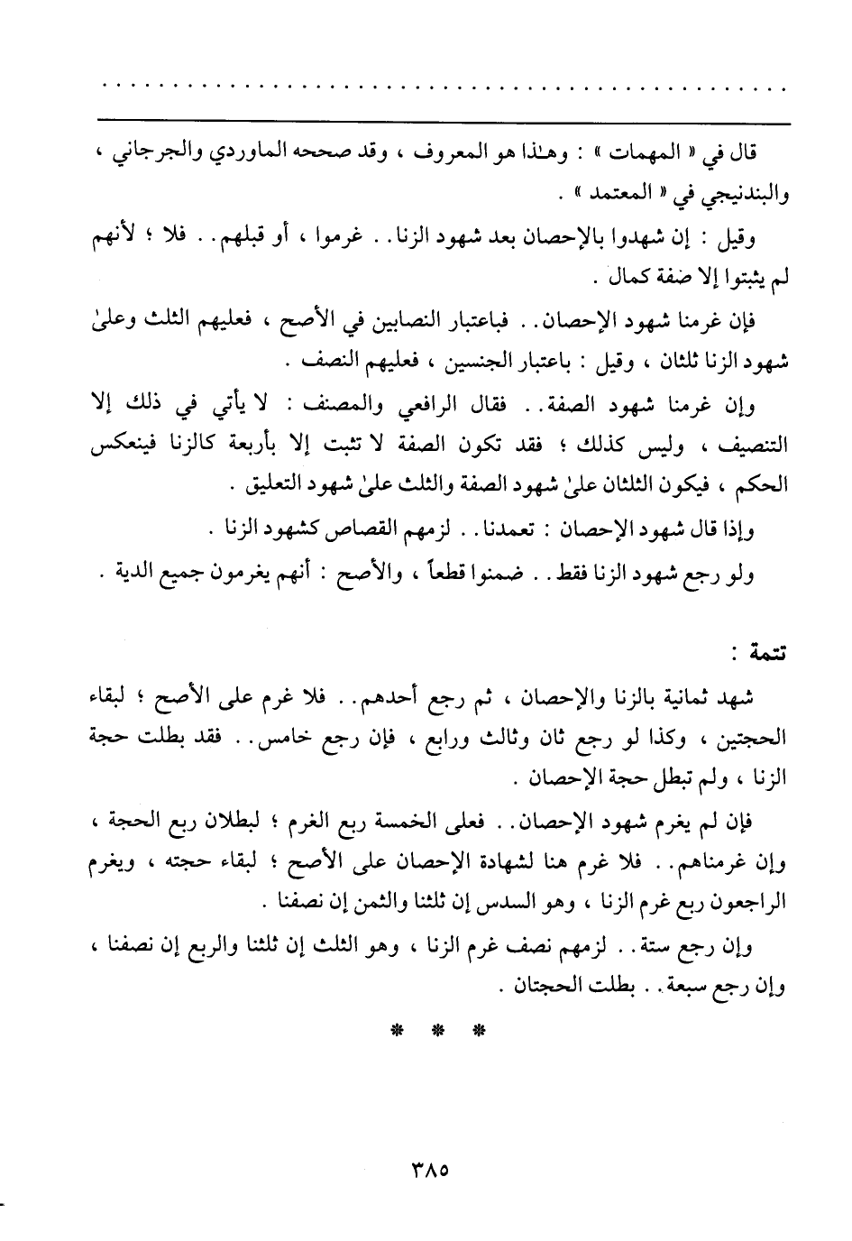 شهد ثمانية بالزنا والإحصان, ثم رجع أحدهم .. فلا غرم على الأصح, لبقاء الحجتين, وكذا لو رجع ثان وثالث ورابع, فإن رجع خامس .. فقط بطلت حجة الزنا, ولم تبطل حجة الإحصان.