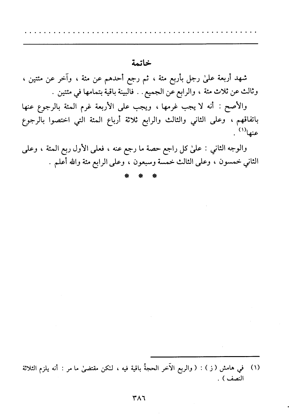 والوجه الثانى: على كل راجع حصة ما رجع عنه, فعلى الأول ربع المئة, وعلى الثاني خمسون, وعلى الثالث خمسة وسبعون, وعلى الرابع مئة والله أعلم.