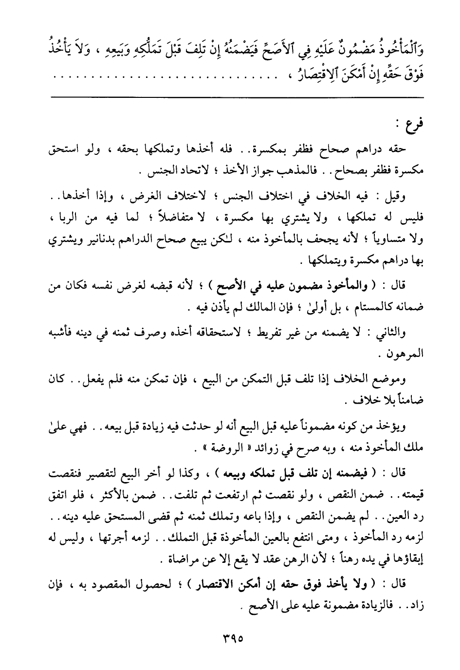وَالْمَاخُوذُ مَضْمُونٌ عَلَيْهِ فِي الأَصَحِّ فَيَضْمَنُهُ إِنْ تَلِفَ قَبْلَ تَمَلُّكِهِ وَبَيعِهِ، وَلاَ يَاخُذُ فَوْقَ حَقِّهِ إِنْ أَمْكَنَ الاِقْتِصَارُ،