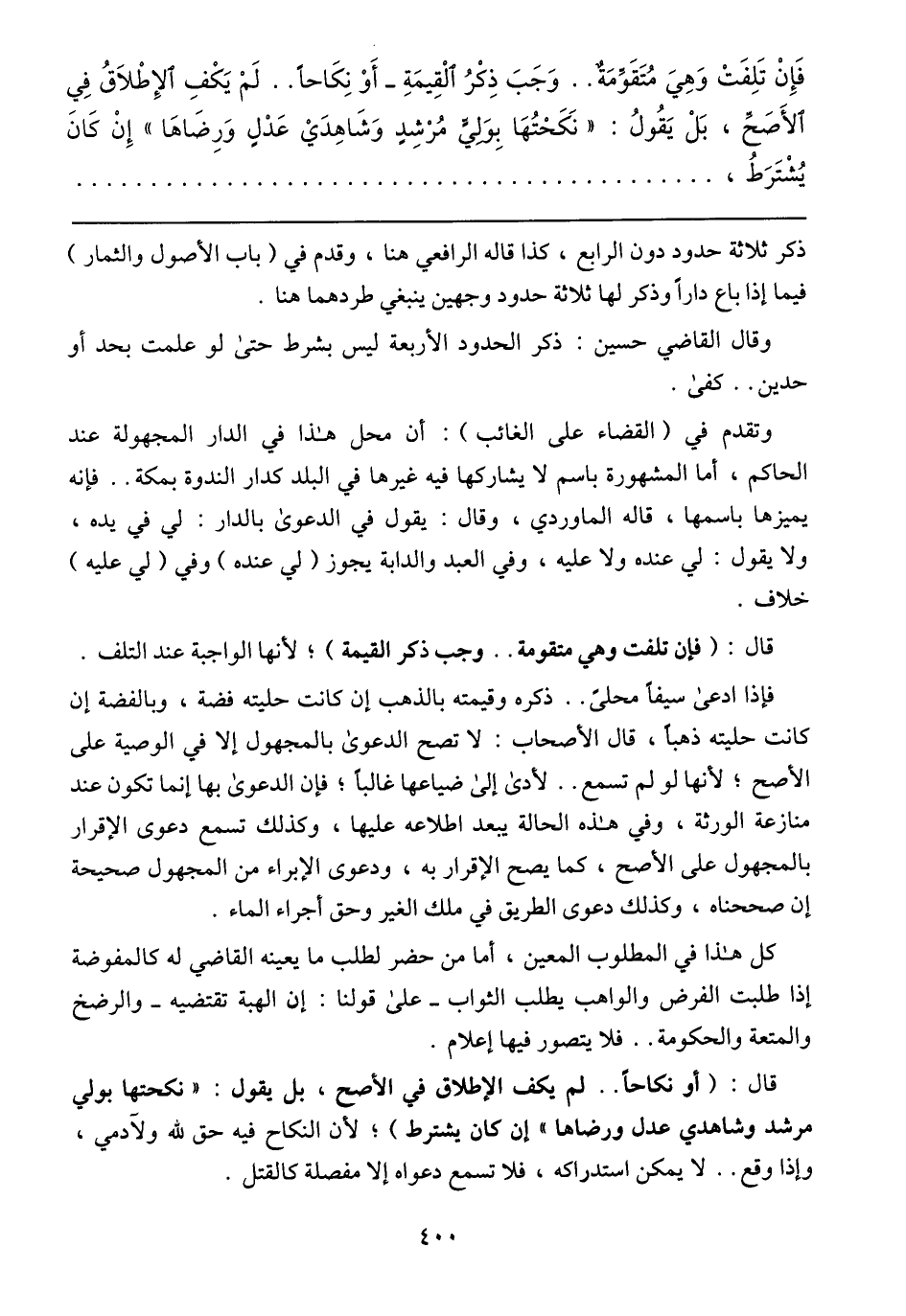 فَإِنْ تَلِفَتْ وَهِيَ مُتَقَوَّمَةٌ .. وَجَبَ ذِكْرُ الْقِيمَةِ- أَوْ نِكَاحًا .. لَمْ يَكْفِ الإطْلاَقُ فِي الَصَحِّ، بَلْ يَقُولُ: (نَكَحْتُهَا بِوَلِيٍّ مُرْشِدٍ وَشَاهِدَيْ عَدْلٍ وَرِضَاهَا) إِنْ كَانَ يُشْتَرَطُ،