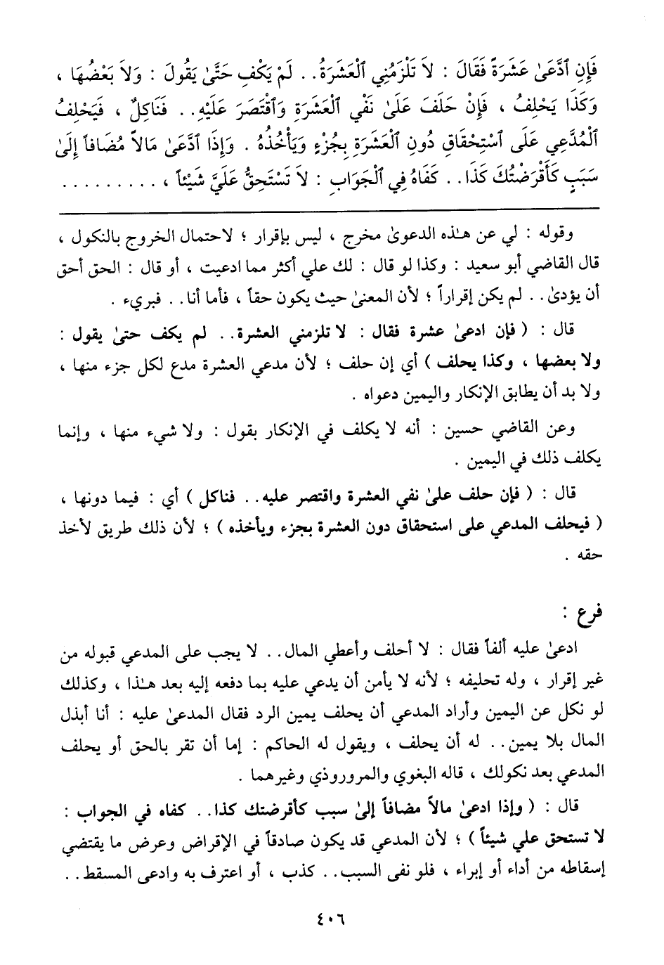 قال: (فإن ادعى عشرة فقال: لاتلزمني العشرة .. لم يكف حتى يقول: ولابعضها، وكذا يحلف) أى إن حلف؛ لأن مدعي العشرة مدع لكل جزء منها، ولا بد أن يطابق الإنكار واليمين دعواه.
