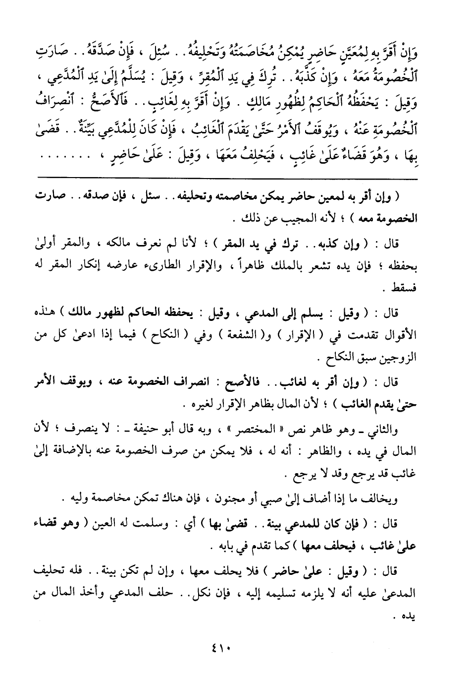 وَإِنْ أَقَرَّ بِهِ لِمُعَيَّنٍ حَاضِرٍ يُمْكِنُ مُخَاصَمَتُهُ وَتَحْلِيُفُهُ .. سُئِلَ، فَإِنْ صَدَّقَهُ .. صَارَتِ الخُصُومَةُ مَعَهُ، وَإِنْ كَذَّبَهُ .. تُرِكَ فِي يَدِ الْمُقِرِّ، وَقِيلَ: يُسَلَّمُ إِلَى يَدِ الْمُدَّعِي، وَقِيلَ: يَحْفَظُهُ الْحَاكِمُ لِظُهُورِ مَالِكٍ. وَإِنْ أَقَرَّ بِهِ لِغَائِبٍ .. فَالأَصَحُّ: انْصِرَافُ الْخُصُومَةِ عَنْهُ، وَيُوقَفُ الأَمْرُ حَتَّى يَقْدَمَ الْغَائِبُ، فَإِنْ كَانَ لِلْمُدَّعِي بَيِّنَةٌ .. قَضَى بِهَا، وَهُوَ قَضَاءٌ عَلَى غَائِبٍ، فَيَحْلِفُ مَعَهَا، وَقِيلَ: عَلَى حَاضِرٍ،