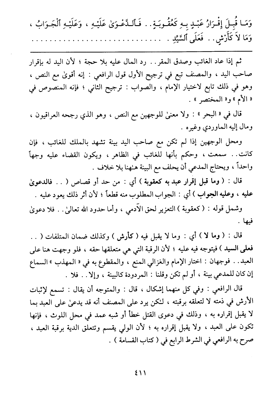 وَمَا قُبِلَ إِقْرَارُ عَبْدٍ بِهِ كَعُقُوبَةٍ .. فَالدَّعْوَى عَلَيْهِ، وَعَلَيْهِ الْجَوَابُ، وَمَا لاَ كَأَرْشٍ .. فَعَلَى السَّيِّدِ
