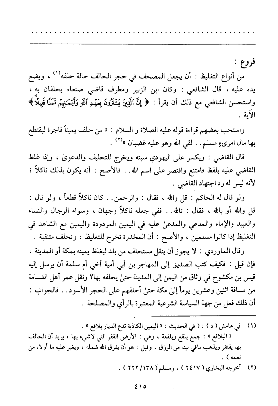 من أنواع التغليظ: أن يجعل المصحف في حجر الحالف حالة حلفه، ويضع يده عليه، قال الشافعي: وكان ابن الزبير ومطرف قاضي صنعاء يحلفان به، واستحسن الشافعي مع ذلك أن يقرأ: {إِنَّ الَّذِينَ يَشْتَرُونَ بِعَهْدِ اللَّهِ وَأَيْمَانِهِمْ ثَمَنًا قَلِيلًا} الآية. واستحب بعضهم قراءة قوله عليه الصلاة والسلام: (من حلف يمينًا فاجرة ليقتطع بها مال امرىءٍ مسلم .. لقي الله وهو عليه غضبان).