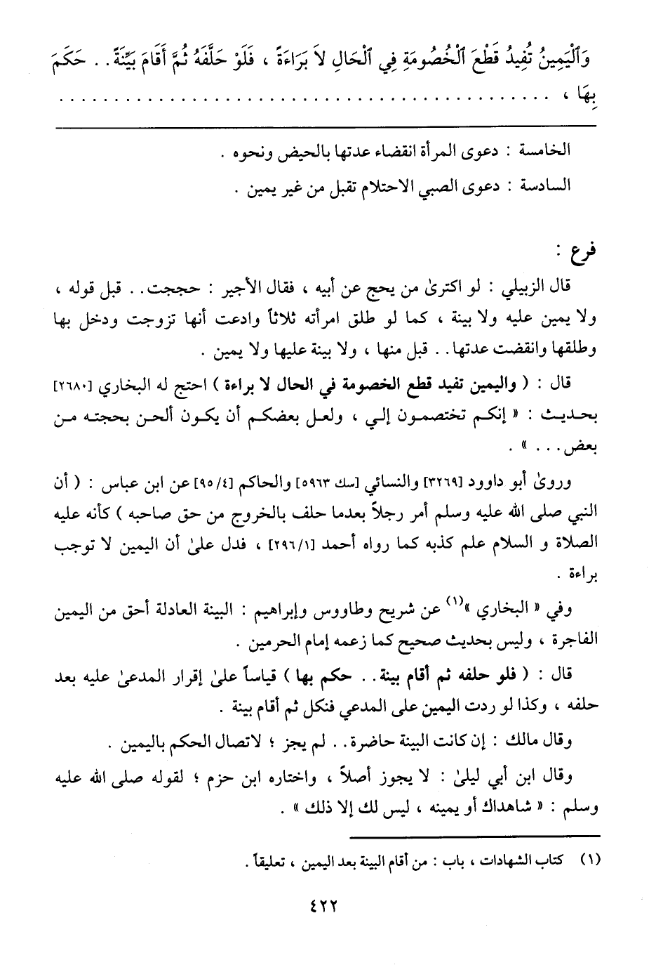 قال: (واليمين تفيد قطع الخصومة في الحال لا براءة) احتج له البخاري] 2680 [بحديث: (إنكم تختصمون إلي، ولعل بعضكم أن يكون ألحن بحجته من بعض ...).