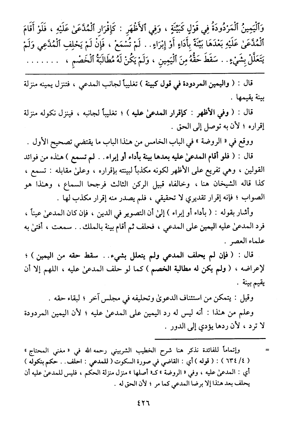 وَالْيَمِينُ الْمَرْدُودَةُ فِي قَوْلٍ كَبَيِّنَةٍ، وَفِي الأَظْهَرِ: كَإِقْرَارِ الْمُدَّعَى عَلَيْهِ، فَلَوْ أَقَامَ الْمُدَّعَى عَلَيْهِ بَعْدَهَا بَيِّنَةً بِأَدَاءٍ أَوْ إِبْرَاءٍ .. لَمْ تُسْمَعْ، فَإِنْ لَمْ يَحْلِفِ الْمُدَّعِي وَلَمْ يَتَعَلَّلَ بِشَيْءٍ .. سَقَطَ حَقُّهُ مِنَ الْيَمِينِ، وَلَمْ يَكُنْ لَهُ مُطَالَبَةُ الْخَصْمِ،