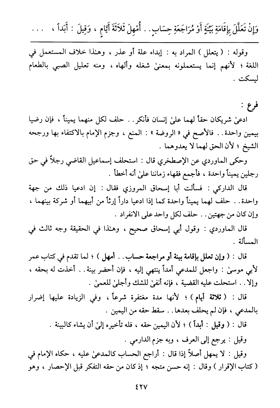وَإِنْ تَعَلَّلَ بِإِقَامَةِ بَيِّنَةٍ أَوْ مُرَاجَعَةِ حِسَابٍ .. أَمْهِلَ ثَلاَثَةَ أَيَّامٍ، وَقِيلَ: أَبَدًا،