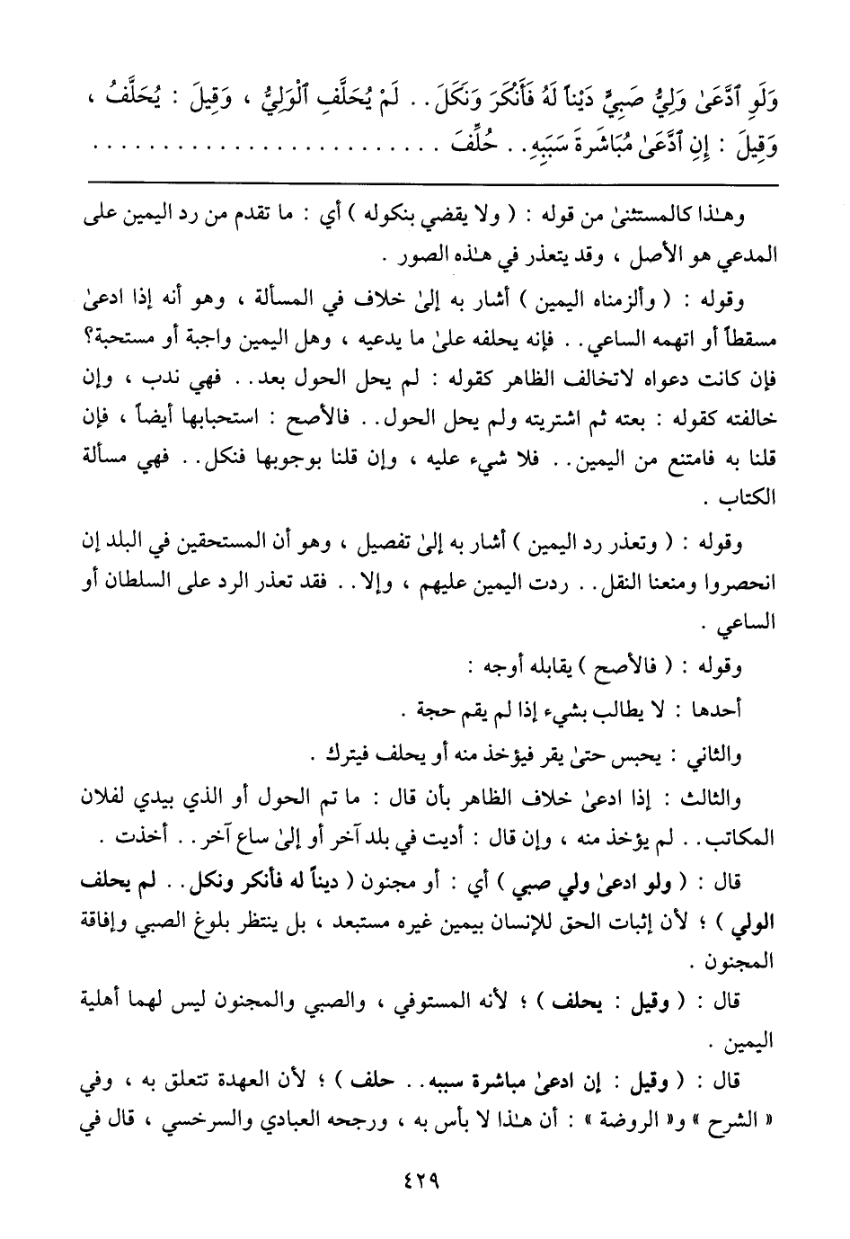 قال: (ولو ادعى ولي صبي) أي: أو مجنون (دينًا له فأنكر ونكل .. لم يحلف الولي)؛ لأن إثبات الحق للإنسان بيمين غيره مستبعد، بل ينتظر بلوغ الصبي وإفاقة المجنون.