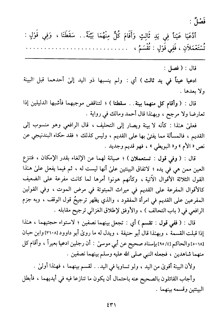 قال: (ففي قول: تقسم) أي: تجعل بينهما نصفين؛ لاستواء حجتيهما، هذا إذا قبلت القسمة، وبهذا قال أبو حنيفة، ويدل له ما روى أبو داوود [3608] وابن حبان [5068] والحاكم [4/ 95] بإسناد صحيح عن أبي موسى: أن رجلين ادعيا بعيرًا، وأقام كل منهما شاهدين، فجعله النبي صلى الله عليه وسلم بينهما نصفين.
