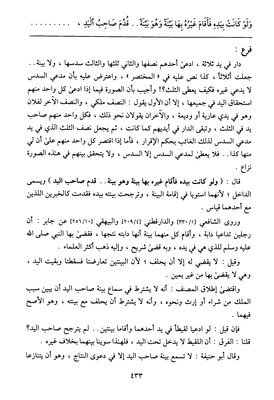 دار في يد ثلاثة، ادعى أحدهم نصفها والثاني ثلثها والثالث سدسها، لا بينة ... جعلت أثلاثًا، كذا نص عليه في (المختصر)، واعترض عليه بأن مدعي السدس لا يدعي غيره فكيف يعطي الثلث؟! وأجيب بأن الصورة فيما إذا ادعى كل واحد منهم استحقاق اليد في جميعها، إلا أن الأول يقول: النص ملكي، والنصف الآخر لفلان وهو في يدي عارية أو وديعة، والآخران يقولان نحو ذلك، فكل واحد منهم صاحب يد في الثلث، وتبقى الدار في أيديهم كما كانت، ثم يجعل نصف الثلث الذي في يد مدعي السدس لذلك الغائب بحكم الإقرار، فأما إذا اقتصر كل واحد منهم على أن لي منها كذا ... فلا يعطى لمدعي السدس إلا السدس، ولا يتحقق بينهم في هذه الصورة نزاع.